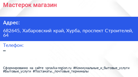 Мастерок, магазин по адресу 682645, Хабаровский край, Хурба, проспект Строителей, 64 в дальнейшем Организация, размещена в следующих категориях: