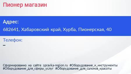 Пионер, магазин по адресу 682641, Хабаровский край, Хурба, Пионерская, 40 в дальнейшем Организация, размещена в следующих категориях: