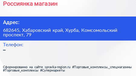 Россиянка, магазин по адресу 682645, Хабаровский край, Хурба, Комсомольский проспект, 79 в дальнейшем Организация, размещена в следующих категориях: