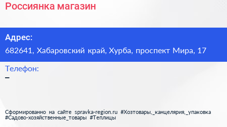 Россиянка, магазин по адресу 682641, Хабаровский край, Хурба, проспект Мира, 17 в дальнейшем Организация, размещена в следующих категориях: