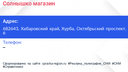 Солнышко, магазин по адресу 682643, Хабаровский край, Хурба, Октябрьский проспект, 6 в дальнейшем Организация, размещена в следующих категориях: