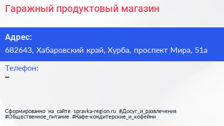 Гаражный, продуктовый магазин по адресу 682643, Хабаровский край, Хурба, проспект Мира, 51а в дальнейшем Организация, размещена в следующих категориях: