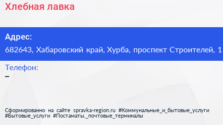 Хлебная лавка по адресу 682643, Хабаровский край, Хурба, проспект Строителей, 1 в дальнейшем Организация, размещена в следующих категориях:
