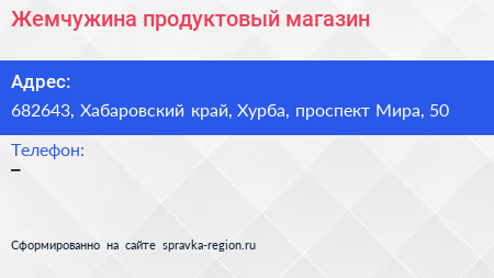Жемчужина, продуктовый магазин по адресу 682643, Хабаровский край, Хурба, проспект Мира, 50 в дальнейшем Организация, размещена в следующих категориях: