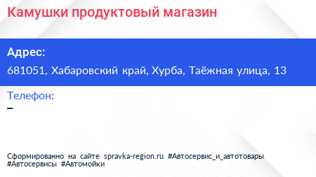 Камушки, продуктовый магазин по адресу 681051, Хабаровский край, Хурба, Таёжная улица, 13 в дальнейшем Организация, размещена в следующих категориях:
