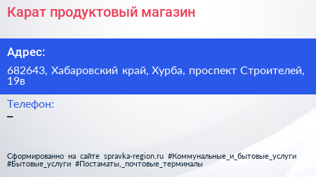 Карат, продуктовый магазин по адресу 682643, Хабаровский край, Хурба, проспект Строителей, 19в в дальнейшем Организация, размещена в следующих категориях: