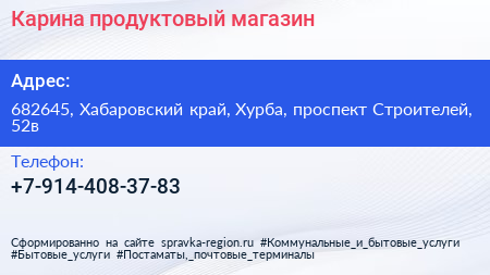 Карина, продуктовый магазин по адресу 682645, Хабаровский край, Хурба, проспект Строителей, 52в в дальнейшем Организация, размещена в следующих категориях: