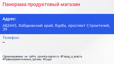 Панорама, продуктовый магазин по адресу 682643, Хабаровский край, Хурба, проспект Строителей, 39 в дальнейшем Организация, размещена в следующих категориях: