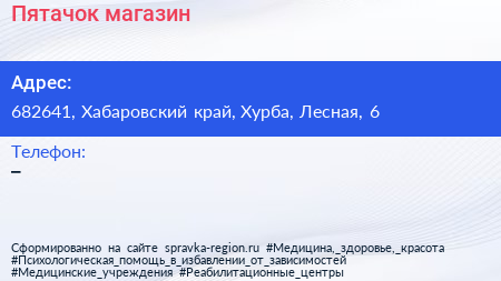 Пятачок, магазин по адресу 682641, Хабаровский край, Хурба, Лесная, 6 в дальнейшем Организация, размещена в следующих категориях: