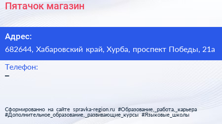 Пятачок, магазин по адресу 682644, Хабаровский край, Хурба, проспект Победы, 21а в дальнейшем Организация, размещена в следующих категориях: