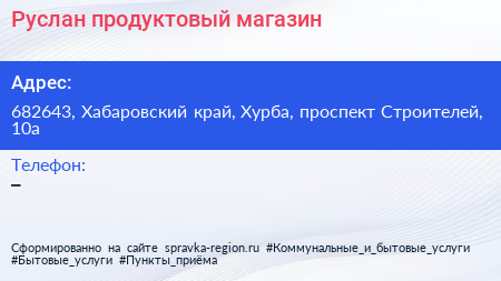 Руслан, продуктовый магазин по адресу 682643, Хабаровский край, Хурба, проспект Строителей, 10а в дальнейшем Организация, размещена в следующих категориях:
