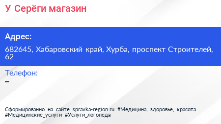 У Серёги, магазин по адресу 682645, Хабаровский край, Хурба, проспект Строителей, 62 в дальнейшем Организация, размещена в следующих категориях: