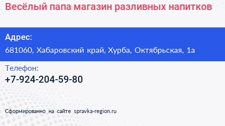 Весёлый папа, магазин разливных напитков по адресу 681060, Хабаровский край, Хурба, Октябрьская, 1а в дальнейшем Организация, размещена в следующих категориях: