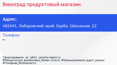 Виноград, продуктовый магазин по адресу 682641, Хабаровский край, Хурба, Школьная, 12 в дальнейшем Организация, размещена в следующих категориях: