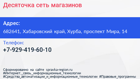 Десяточка, сеть магазинов по адресу 682641, Хабаровский край, Хурба, проспект Мира, 14 в дальнейшем Организация, размещена в следующих категориях: