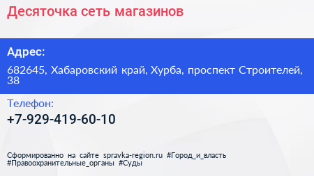 Десяточка, сеть магазинов по адресу 682645, Хабаровский край, Хурба, проспект Строителей, 38 в дальнейшем Организация, размещена в следующих категориях: