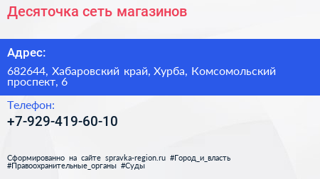 Десяточка, сеть магазинов по адресу 682644, Хабаровский край, Хурба, Комсомольский проспект, 6 в дальнейшем Организация, размещена в следующих категориях: