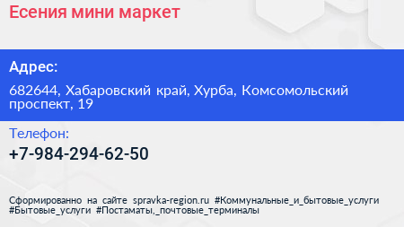Есения, мини-маркет по адресу 682644, Хабаровский край, Хурба, Комсомольский проспект, 19 в дальнейшем Организация, размещена в следующих категориях: