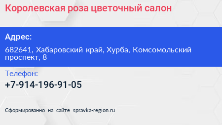 Королевская роза, цветочный салон по адресу 682641, Хабаровский край, Хурба, Комсомольский проспект, 8 в дальнейшем Организация, размещена в следующих категориях: