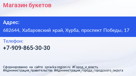 Магазин букетов по адресу 682644, Хабаровский край, Хурба, проспект Победы, 17 в дальнейшем Организация, размещена в следующих категориях:
