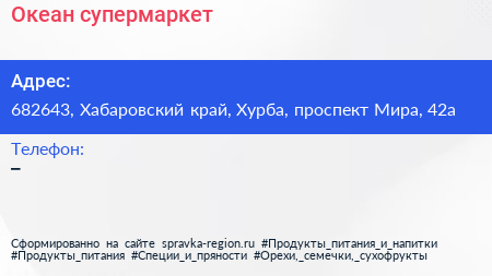 Океан, супермаркет по адресу 682643, Хабаровский край, Хурба, проспект Мира, 42а в дальнейшем Организация, размещена в следующих категориях: