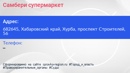 Самбери, супермаркет по адресу 682645, Хабаровский край, Хурба, проспект Строителей, 56 в дальнейшем Организация, размещена в следующих категориях:
