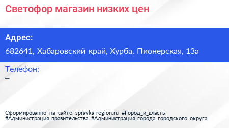 Светофор, магазин низких цен по адресу 682641, Хабаровский край, Хурба, Пионерская, 13а в дальнейшем Организация, размещена в следующих категориях: