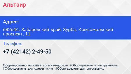Альтаир по адресу 682644, Хабаровский край, Хурба, Комсомольский проспект, 11 в дальнейшем Организация, размещена в следующих категориях: