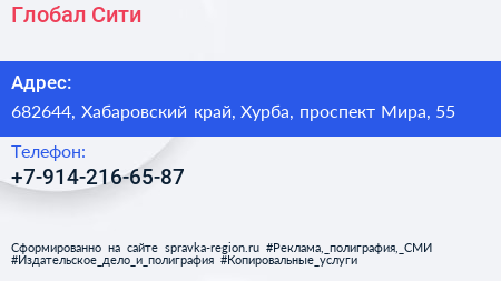 Глобал Сити по адресу 682644, Хабаровский край, Хурба, проспект Мира, 55 в дальнейшем Организация, размещена в следующих категориях:
