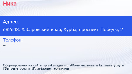 Ника по адресу 682643, Хабаровский край, Хурба, проспект Победы, 2 в дальнейшем Организация, размещена в следующих категориях: