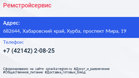 Ремстройсервис по адресу 682644, Хабаровский край, Хурба, проспект Мира, 19 в дальнейшем Организация, размещена в следующих категориях: