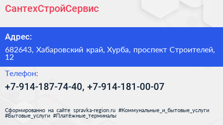 СантехСтройСервис по адресу 682643, Хабаровский край, Хурба, проспект Строителей, 12 в дальнейшем Организация, размещена в следующих категориях:
