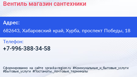 Вентиль, магазин сантехники по адресу 682643, Хабаровский край, Хурба, проспект Победы, 18 в дальнейшем Организация, размещена в следующих категориях:
