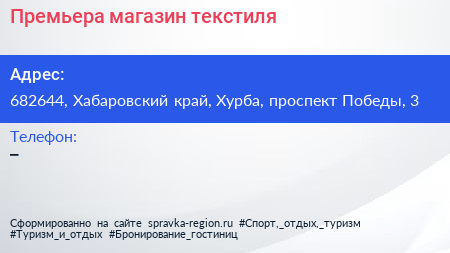 Премьера, магазин текстиля по адресу 682644, Хабаровский край, Хурба, проспект Победы, 3 в дальнейшем Организация, размещена в следующих категориях: