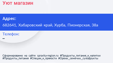Уют, магазин по адресу 682641, Хабаровский край, Хурба, Пионерская, 38а в дальнейшем Организация, размещена в следующих категориях: