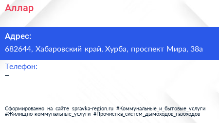 Аллар по адресу 682644, Хабаровский край, Хурба, проспект Мира, 38а в дальнейшем Организация, размещена в следующих категориях: