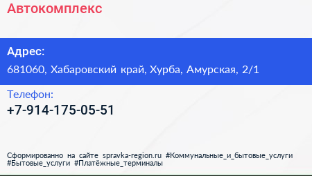 Автокомплекс по адресу 681060, Хабаровский край, Хурба, Амурская, 2/1 в дальнейшем Организация, размещена в следующих категориях: