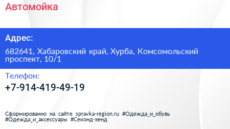 Автомойка по адресу 682641, Хабаровский край, Хурба, Комсомольский проспект, 10/1 в дальнейшем Организация, размещена в следующих категориях: