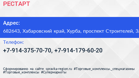 РЕСТАРТ по адресу 682643, Хабаровский край, Хурба, проспект Строителей, 3а в дальнейшем Организация, размещена в следующих категориях: