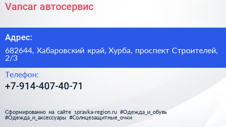 Vancar, автосервис по адресу 682644, Хабаровский край, Хурба, проспект Строителей, 2/3 в дальнейшем Организация, размещена в следующих категориях: