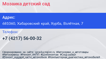 Мозаика, детский сад по адресу 681060, Хабаровский край, Хурба, Взлётная, 7 в дальнейшем Организация, размещена в следующих категориях: