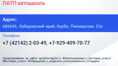 ПАТП, автошкола по адресу 682641, Хабаровский край, Хурба, Пионерская, 15а в дальнейшем Организация, размещена в следующих категориях: