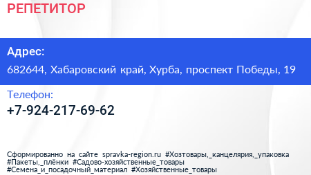 РЕПЕТИТОР по адресу 682644, Хабаровский край, Хурба, проспект Победы, 19 в дальнейшем Организация, размещена в следующих категориях: