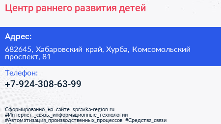 Центр раннего развития детей по адресу 682645, Хабаровский край, Хурба, Комсомольский проспект, 81 в дальнейшем Организация, размещена в следующих категориях: