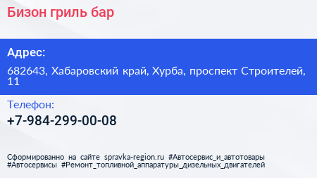 Бизон, гриль-бар по адресу 682643, Хабаровский край, Хурба, проспект Строителей, 11 в дальнейшем Организация, размещена в следующих категориях: