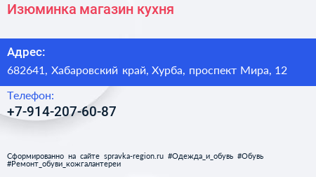 Изюминка, магазин-кухня по адресу 682641, Хабаровский край, Хурба, проспект Мира, 12 в дальнейшем Организация, размещена в следующих категориях: