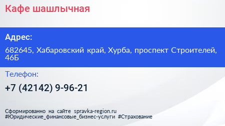 Кафе-шашлычная по адресу 682645, Хабаровский край, Хурба, проспект Строителей, 46Б в дальнейшем Организация, размещена в следующих категориях: