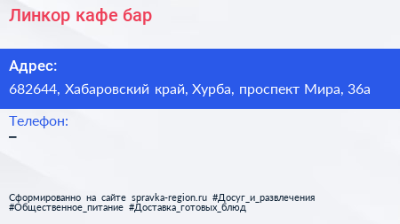 Линкор, кафе-бар по адресу 682644, Хабаровский край, Хурба, проспект Мира, 36а в дальнейшем Организация, размещена в следующих категориях: