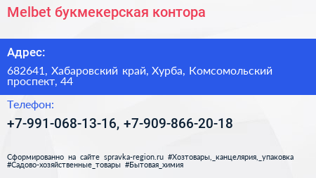 Melbet, букмекерская контора по адресу 682641, Хабаровский край, Хурба, Комсомольский проспект, 44 в дальнейшем Организация, размещена в следующих категориях: