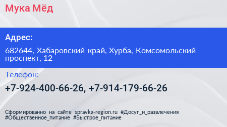 Мука & Мёд по адресу 682644, Хабаровский край, Хурба, Комсомольский проспект, 12 в дальнейшем Организация, размещена в следующих категориях: